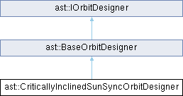 类 ast::CriticallyInclinedSunSyncOrbitDesigner 继承关系图:Public 成员函数 | |