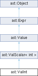 类 ast::ValInt 继承关系图:Public 成员函数 | |