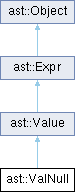 类 ast::ValNull 继承关系图:Public 成员函数 | |